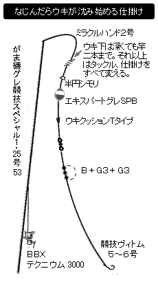 仕掛けのセッティングで難しいのはオモリの加減。できるだけウキがじわっと沈むように調整しなければならない。そのためには、使うウキがどれくらいのガン玉で沈み始めるかを知っておく必要がある。 この仕掛けは、覚えておくとなかなか重宝する。 たとえば、竿一本の位置にウキ止めを設定した場合、竿一本まで仕掛けが入った時点で当然ウキは沈み始めるが、それからさらに1mなり2mなりウキを沈めてゆくのである。