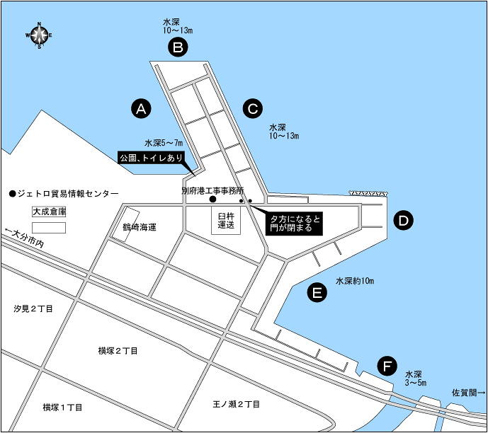 ■A〜C:大在公共埠頭の先端部であるため人気が高く、釣人が多いポイント。カゴ釣りではアジの20〜30cmクラスが夏から冬にかけて釣れている。それに加え、年によって若干ムラはあるが、秋口のサバも釣れる。サイズが30〜40cmあり、こちらも人気を集めている。Aからのカゴ釣りで、水深はサオ1本〜1本半を攻めると大型のマダイが狙える。また、足下でのサビキ仕掛けでは年中小アジが釣れファミリーにも最適。夜間は入り口の門が閉まるため立ち入り禁止となる。