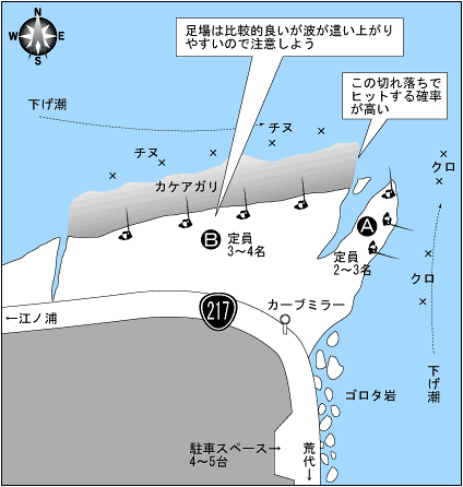 A地点はクロ狙いのポイントで左流れの潮を沖の潮目まで流す。途中仕掛けに張りを与えてやりツケエを先行させてやる。5〜6月の間は足の裏サイズの数釣りが可能。
