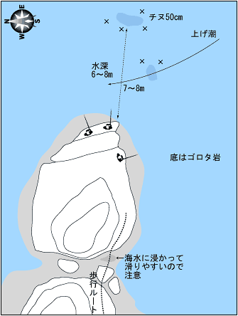 国道217号線千怒崎峠から徒歩5分程で辿り着く地磯。一旦浜に出て浜伝いに移動する。満潮時には通りにくいところがあるので注意。