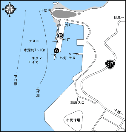 津久見市街から車で約15分の場所。ポイントはA、Bがよい。12月頃、モイカがAでよく釣れる。チヌは夜釣りに実績が高く、匂いの強いマキエを使用すると釣果が上がる。水深はサオ1本半程度。