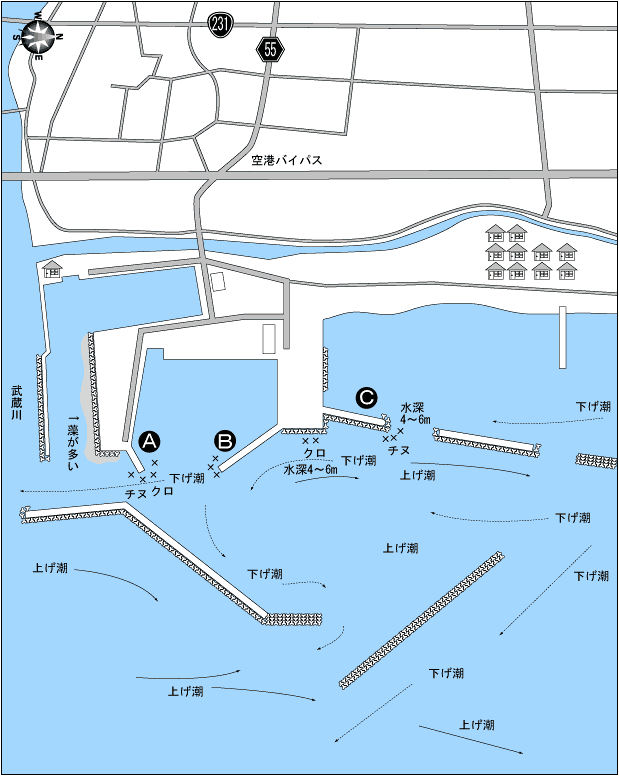ポイントはA、Bの波止の先端周りでチヌ、クロが狙え、Cの先端はチヌの実績がある。また、BとCの中間のテトラではクロが狙える。