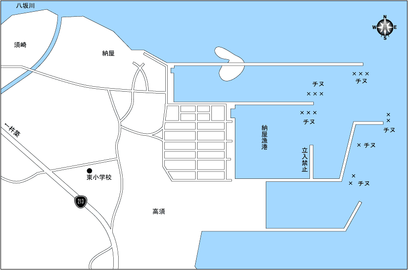 八坂川の河口に位置し、全体的に水深が浅いのが特徴だが、40cmオーバーのチヌが望める釣場。水深が浅いため満潮前後が狙い目で、ポイントも波止の先端周辺に集中する。特に実績が高いのは、L字に折れた波止の角周辺と先端にかけてだ。コツはタナを底に合わせて釣るとよく、ツケエはオキアミ生かシャコで実績が高い。夜釣りでもよく釣れており、その時は遠投せずに足元を狙うとよいようだ。