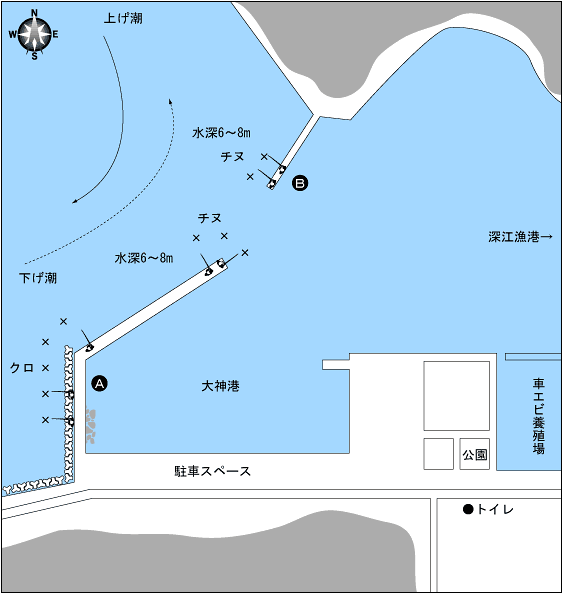 Bの波止は先端周りでチヌ、Aの波止はテトラの中間から先端にかけてチヌ、クロが狙える。特にクロはテトラで実績が高く、サオ3本先くらいを流すとよいだろう。