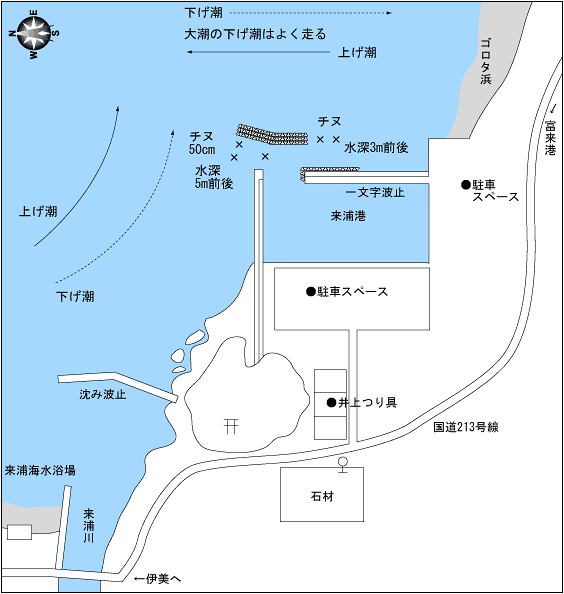 テトラが入っている波止は水深が浅く、マキエが届く範囲で出来るだけ遠投すればチヌ・メイタが狙える。反対の波止(北側)は先端周辺で水深が5mくらいあり、こちらの方がチヌ、クロの実績が高い。船道のカケアガリや潮目を狙ってみよう。