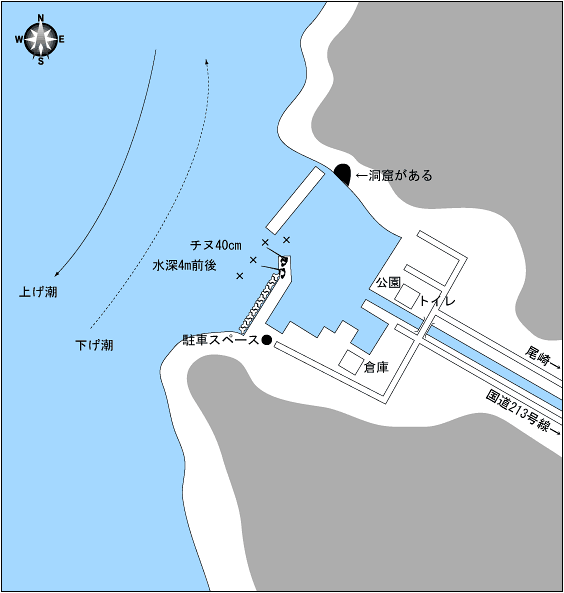 外波止の中間から先端にかけてがメインで、テトラ側がよい。水深は付け根側が浅く、先端側でも4mくらいしかない。