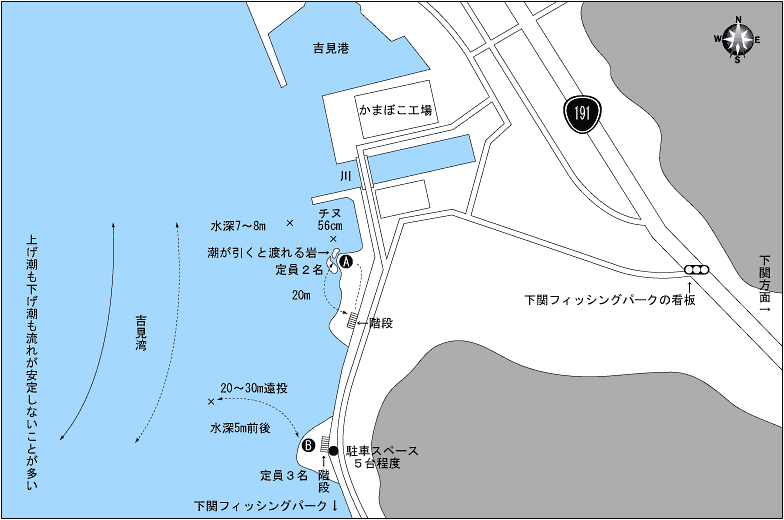 ここで本当に釣れるのか!?と思わせるような穴場。すぐ近くにはかまぼこ工場があるのだ。そのため、魚にとってはエサの少ない冬場でも居心地が良いらしく寄ってきている。図Aは河口寄りなので夏〜秋にチヌの良型の実績が高い好ポイント。図Bは遠浅で、遠投するとクロが食ってくる。